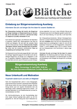 Auf den folgenden Seiten finden Sie viele Informationen über Auerberg, seine Einrichtungen und Veranstaltungen, seine Vereine und weiteren Akteure. Aktuelle Meldungen halten Sie zudem auf dem Stand, was in Ihrer Umgebung geschieht. Eine bedeutsame Handlungsgrundlage für die Arbeit des Ortsausschusses Auerberg ist das im Auftrag der Stadt Bonn erstellte „Integrierte Entwicklungskonzept“. Wichtige Projekte daraus (u.a. die Themen Begegnungszentrum und Umgestaltung der Auerberger Mitte) konnte der Ortsausschuss mit einem eingebrachten Bürgerantrag zum Wohle von Auerberg erfolgreich beeinflussen.