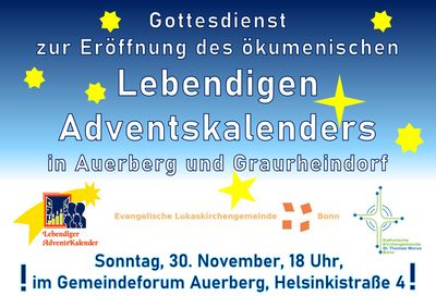 Ein Ökumenischer Gottesdienst am 1. Adventssonntag, 30. November 2025, 18.00 Uhr, im Ev. Gemeindeforum Auerberg, Helsinkistr. 4, bildet den Auftakt zum diesjährigen Lebendigen Adventskalender in Auerberg und Graurheindorf. Vom 1. bis 23. Dezember laden auch in diesem Jahr wieder Familien und verschiedene Einrichtungen in den beiden Ortsteilen ein, allabendlich vor einem geschmückten Adventsfenster zusammen zu kommen und sich auf Weihnachten einzustimmen.